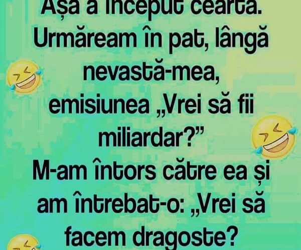 Așa a început cearta. Urmăream în pat, lângă nevastă-mea, emisiunea „Vrei să fii miliardar?” M-am întors către ea și am întrebat-o: „Vrei să facem dragoste?„Nu”,